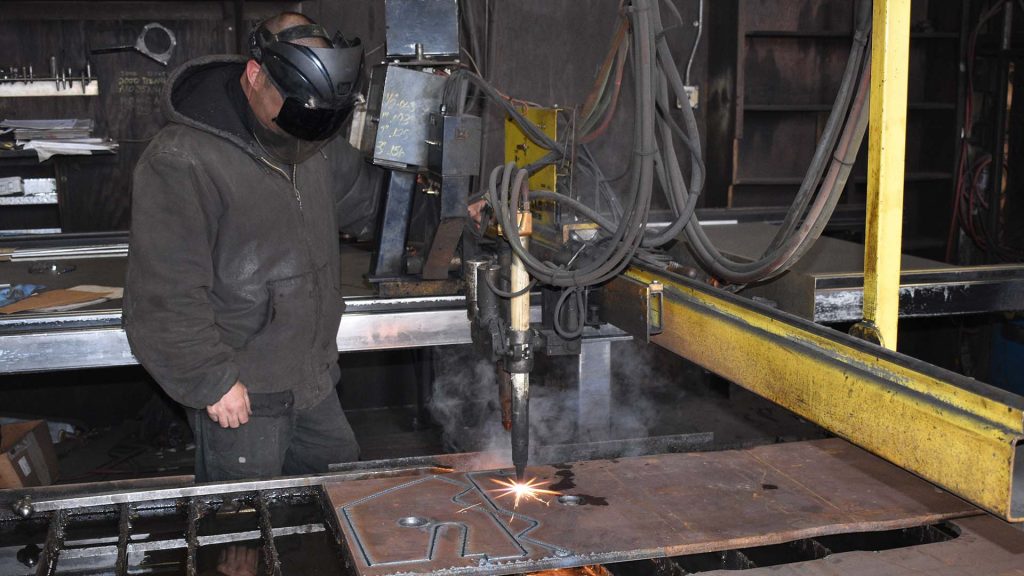 Our ESAB plasma/oxyacetylene torch can burn through any metal material up to 2” thick and can handle material sheets up to 5’ x 10’. The CAM (computer assisted manufacturing) system can be programmed to precisely and cleanly cut almost any design you can imagine.